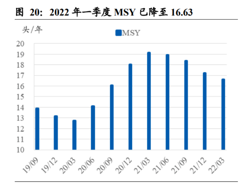 能繁母豬存欄減少 8.3%,產能利用率大幅下降。盡管從 2021 年下半年起,生豬養 殖行業就已開始去產能,但能繁母豬存欄從 2021 年 6 月的 4564 萬頭下降至 2022 年 3 月的 4185 萬頭,近一年時間降幅僅 8.3%。并且 2022 年一季度行業平均 MSY 降至 16.63,較 2021 年同期回落 13.16%。鑒于二元母豬替代三元母豬后 PSY 的提 升、以及非洲豬瘟疫情緩和下死淘率的降低,MSY 的下降可認為是養殖行業主動降 低了能繁母豬的產仔頻次所致。此外,由于豬價低于成本線,而料肉比會隨生豬體 重增長而上升,為盡可能降低成本、減少開支,養殖場紛紛提前出欄肉豬。2022 年 4 月,全國生豬出欄均重約 117 公斤,較 2021 年同期的 136 公斤大幅下降近 14%。MSY 和生豬出欄體重均同比大幅下降,意味著當前生豬產能并未得到完全利用。