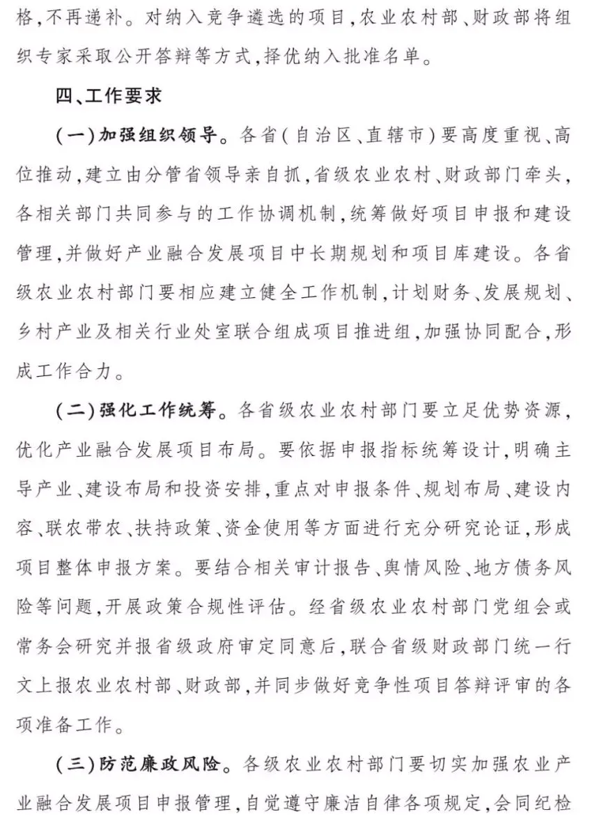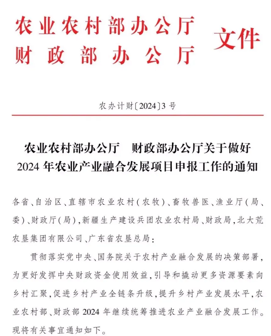 為更好發揮中央財政資金使用效益,引導和撬動更多資源要素向鄉村匯聚,促進鄉村產業全鏈條升級,提升鄉村產業發展水平,農業農村部、財政部2024年繼續統籌推進農業產業融合發展工作,具體申報通知如下:
