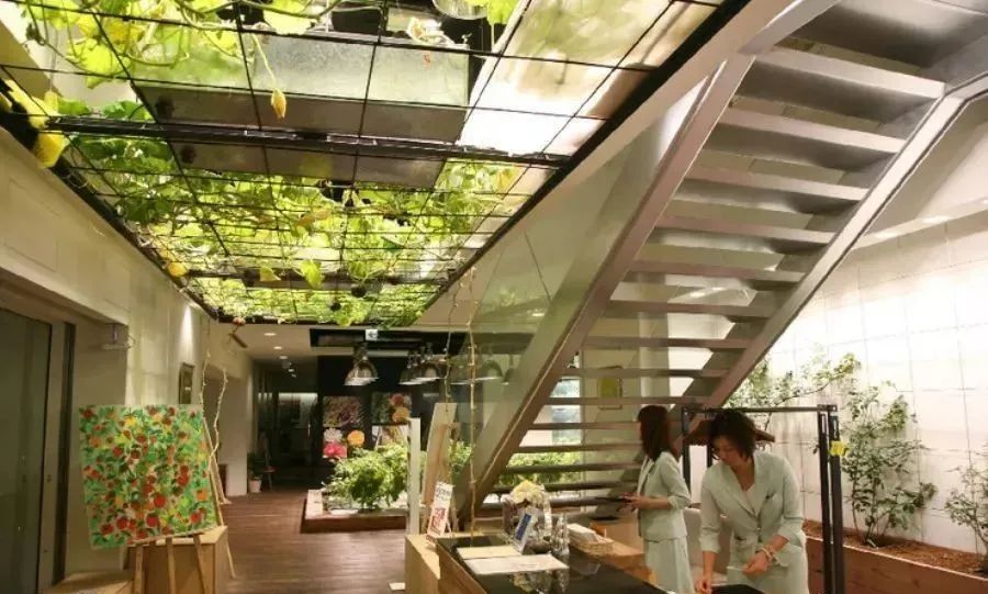 公司一樓是花簇圍繞的咖啡廳,二樓是生機盎然的休閑室,而三樓以上的辦公區域,無論是樓梯口、走廊或是員工餐廳,你都可以隨處感受到花草與蔬果的存在,就像是在農場中生活一樣。