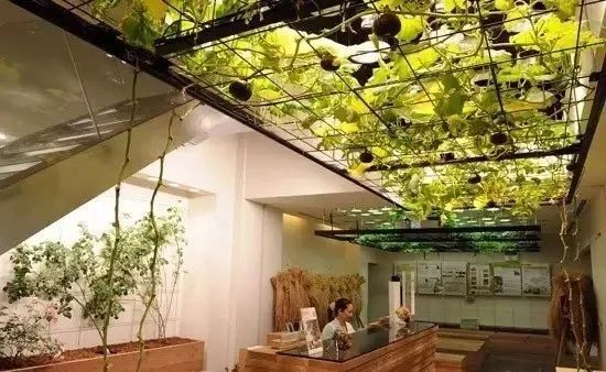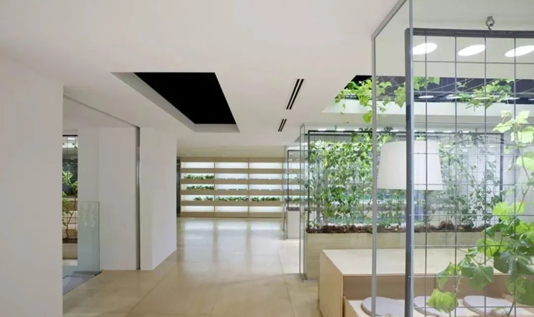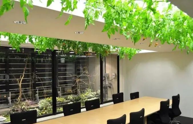 辦公人員和作物共享一個空間,番茄藤蔓會懸掛在會議桌的上方,檸檬和西番蓮果樹被用作辦公空間的隔板,會議室里種著沙拉葉,長凳下種有豆芽,大堂里還有稻田和西蘭花田……