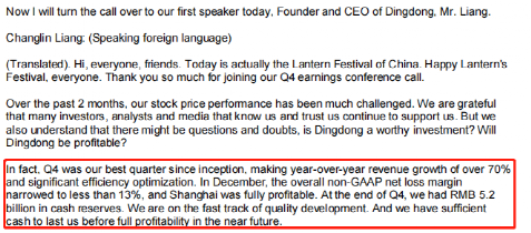 去年12月,整體非GAAP凈虧損幅度收窄至不到13%,上海地區實現完全盈利。”并稱公司處在質量發展的快車道上,力爭截至第四季度末Q2末實現長三角地區完全盈利,Q4在全國接近盈利。