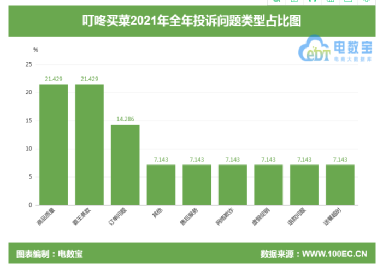 根據電訴寶網絡消費糾紛調解平臺數據顯示,叮咚買菜2021年因商品質量、霸王條款、訂單問題、售后服務、網絡欺詐、虛假促銷、退款問題、送餐超時等原因遭到投訴,其中占比最高的便是商品質量和霸王條款,再結合往期處罰信息可見平臺質量問題已非常嚴峻。
