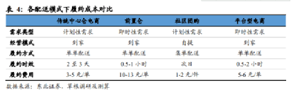 據東北證券研報數據統計,前置倉模式的履約費用約為10-13元/單,單位履約成本超出傳統中心倉電商7-8元/單、超出社區團購9-11元/單、平臺型電商5-7元/單。