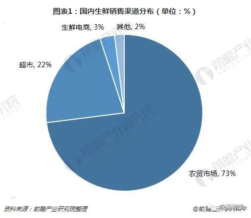 國內生鮮銷售主要通過農貿市場、超市、生鮮電商等渠道來完成,其中,傳統的農貿市場是最主要的銷售渠道,其占比為73%,遠遠高于其他銷售渠道。