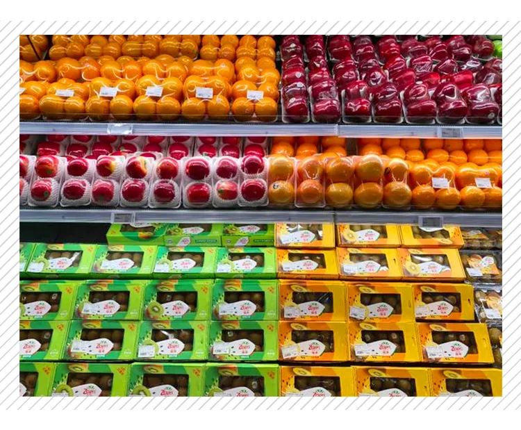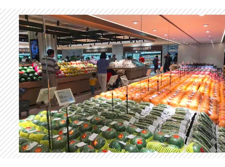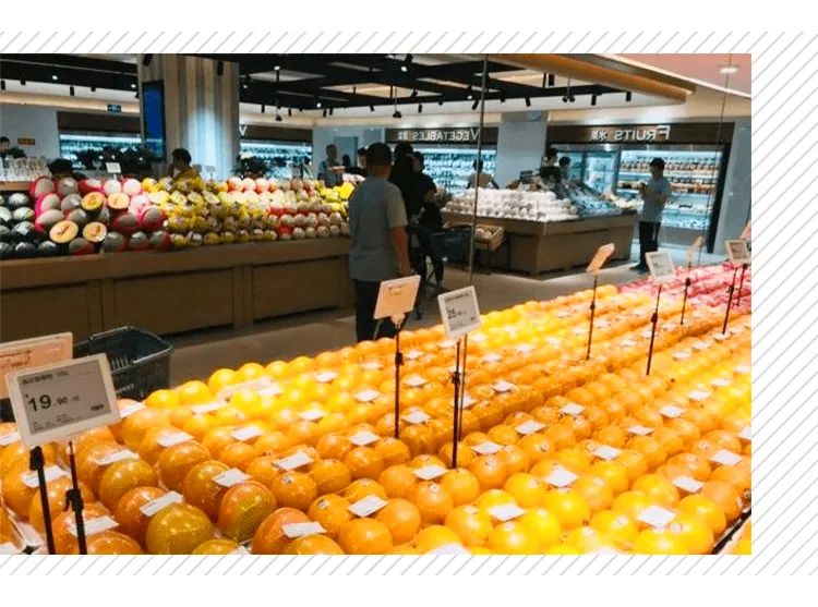 首先,在商品陳列上,生鮮水果全部為“扁平化陳列”方式,利用“大面積”有效創造視覺沖擊力。消費者進店之后,色彩紛呈的水果區便映入眼簾,荔枝、蘋果、鮮橙等各色水果應有盡有,蔬菜、飲品等承接在后,進而過渡至零食酒水、日用百貨、餐飲區等。