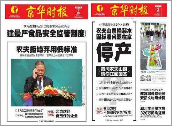 但水戰并不是一帆風順的。2013年,“標準門”事件爆發,《京華時報》用27天時間,67個版面,78篇報道來坐實農夫山泉“標準不如自來水”這一觀點。