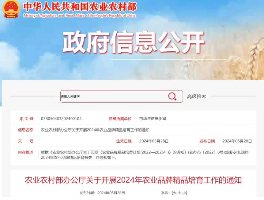 根據(jù)《農(nóng)業(yè)農(nóng)村部辦公廳關(guān)于印發(fā)〈農(nóng)業(yè)品牌精品培育計劃(2022—2025年)〉的通知》(農(nóng)辦市〔2022〕8號)部署安排,現(xiàn)將2024年農(nóng)業(yè)品牌精品培育有關(guān)工作通知如下。