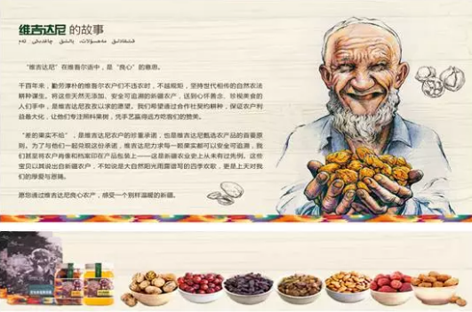 “維吉達尼”是維語“良心”的意思,無論在維吉達尼的淘寶店鋪,還是微博、微信上,創業者希望把農戶的故事融入至產品中,每個產品蘊含著一個故事。在店鋪成立之初,維吉達尼以農戶實名發了幾條微博,同時得到姚晨、周鴻祎等名人微博轉發,剛剛成立的維吉達尼知名度迅速提升,維吉達尼也被打造為一個有溫度、有情懷的品牌?,F在,維吉達尼有大約500家合作農戶,從互聯網上重復購買的客戶約3萬人,農民和農產品消費者之間成為了一個溫暖的社群。