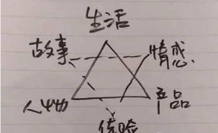 內容該怎么制造呢?大家可以拿一個筆畫一個正三角型。上面是生活,左下角是人物,右下角是產品,然后再衍生出一個倒三角形,左上角是故事,右上角是情感,下面是體驗。