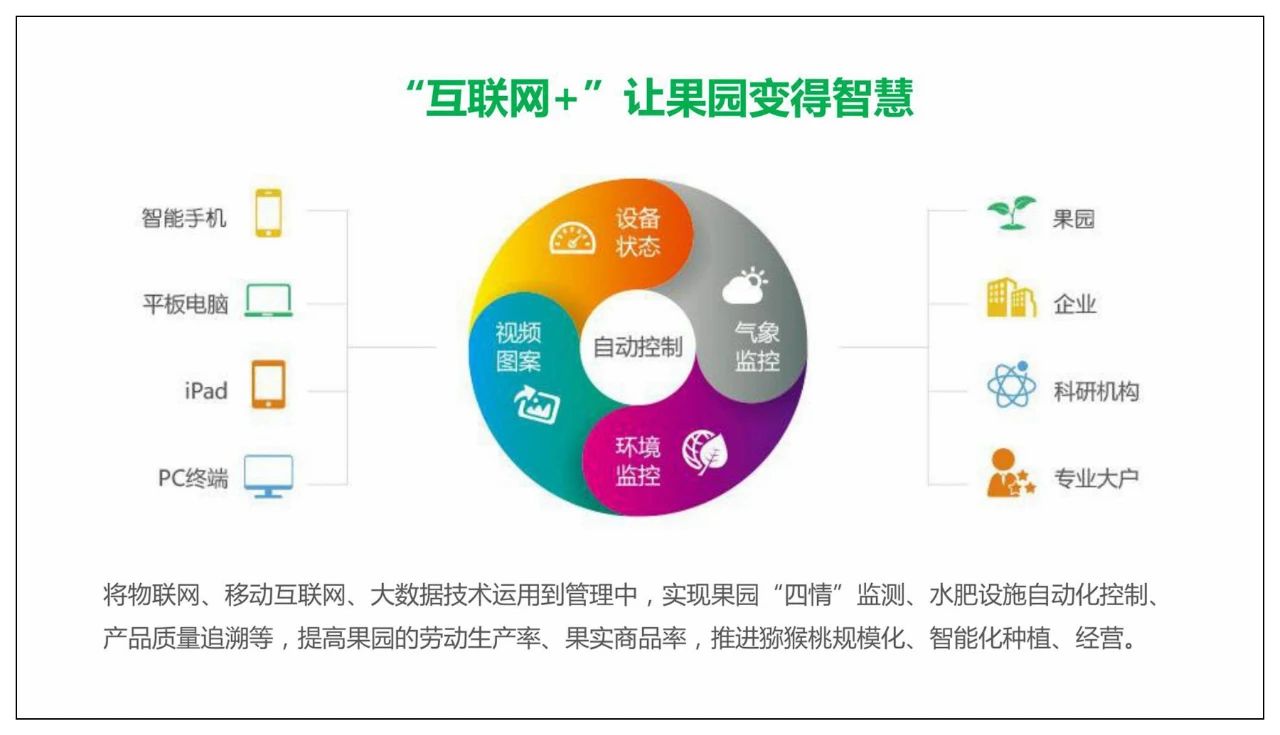 智慧果園將物聯網、移動互聯網、大數據技術運用到管理中,實現果園四情監測、水肥設施自動化控制、 產品質量追溯等,提高果園的勞動生產率、果實商品率,推進獼猴桃規模化、智能化種植、經營。